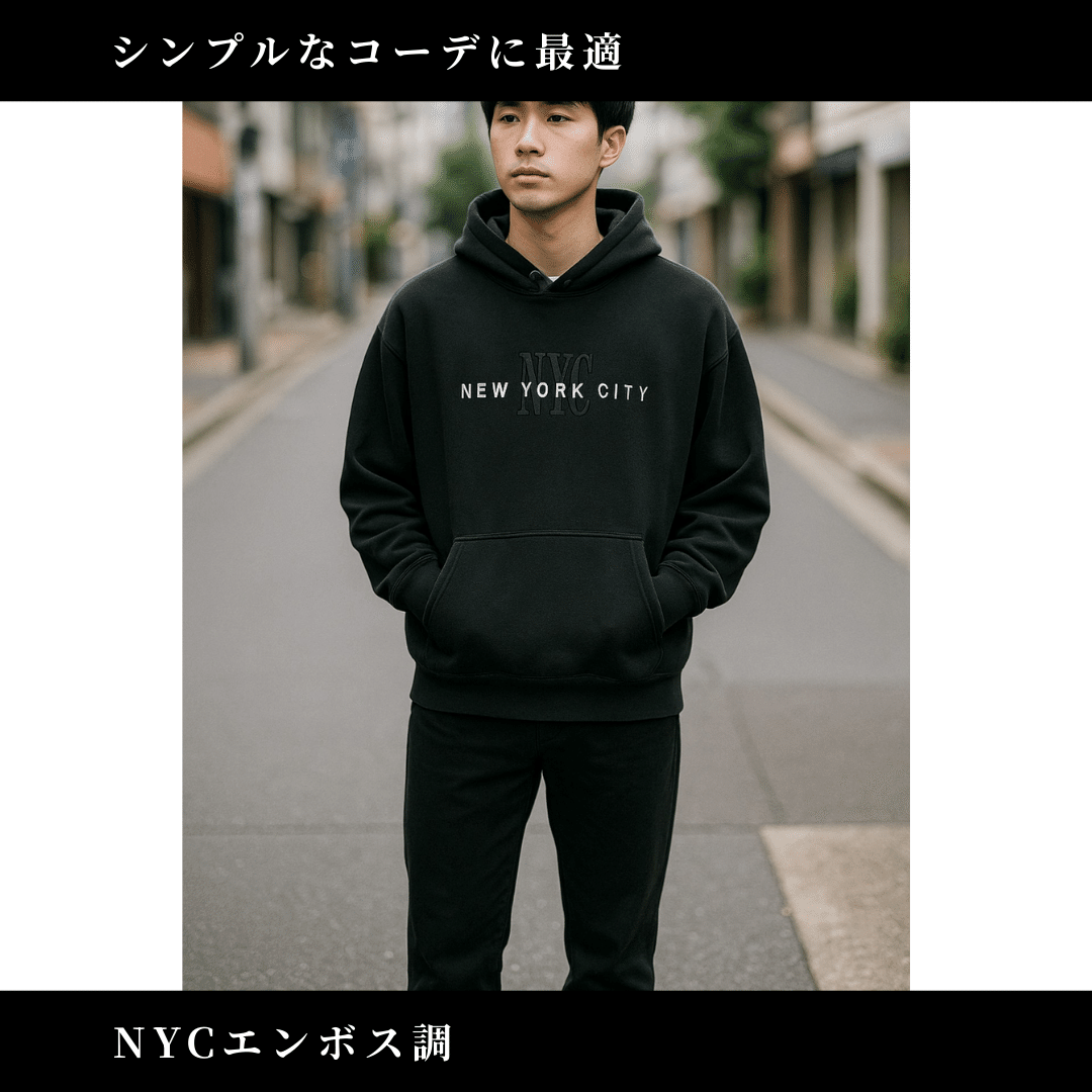 特徴:NYCロゴのエンボス調デザイン。ブラックの無地ベースに控えめなロゴが映え、カジュアルコーデにぴったり。