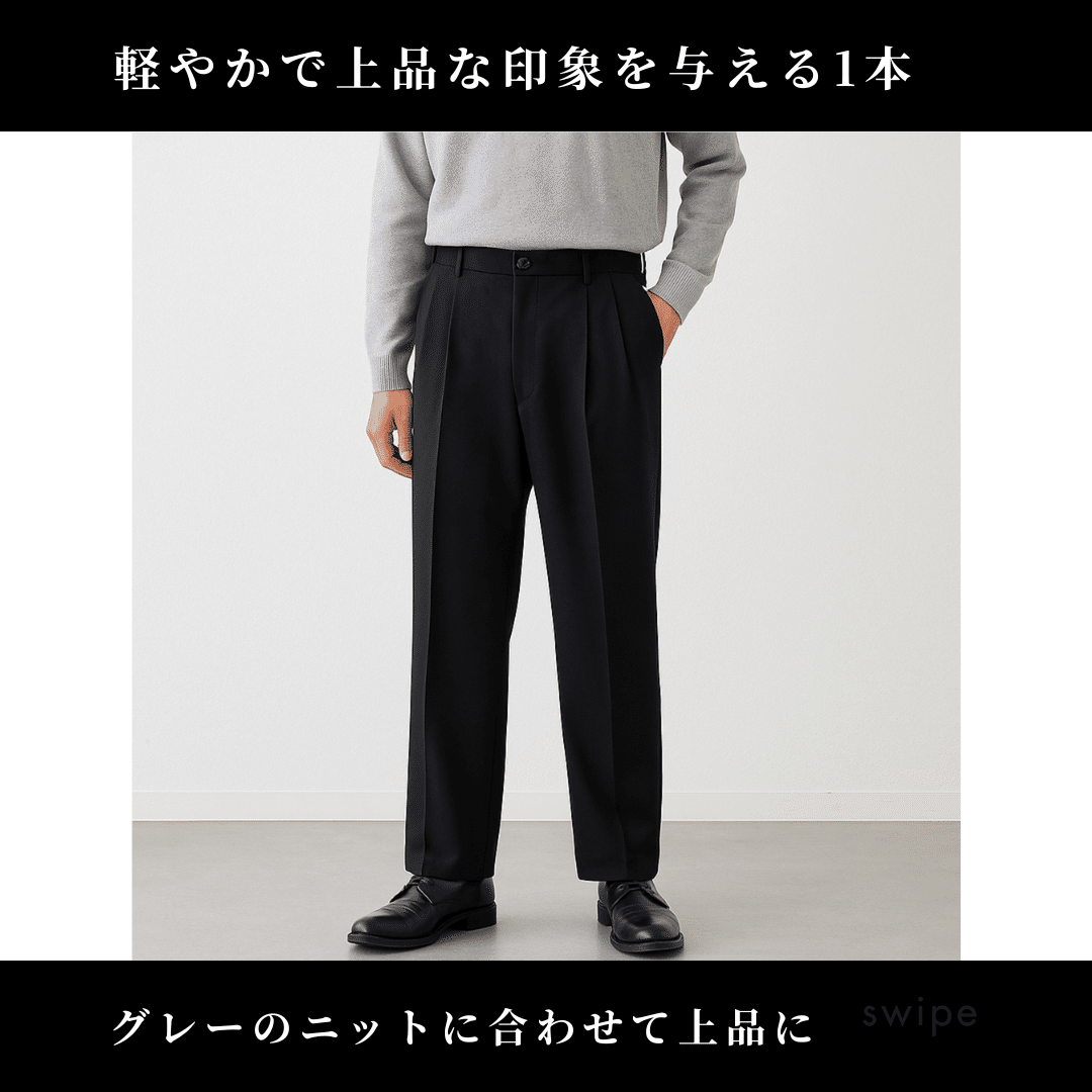 上質なスラックスほど、シンプルなコーデを格上げしてくれるもの。