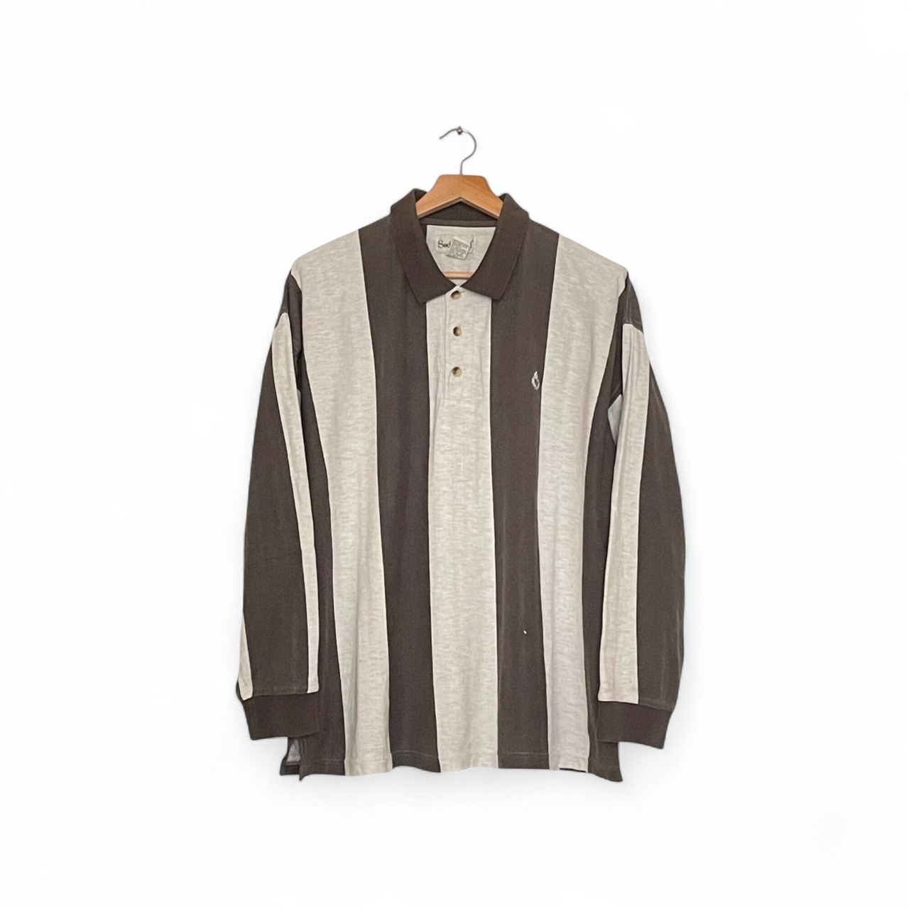 そんな方におすすめなのが、この太ストライプが目を引く長袖ポロシャツです。
