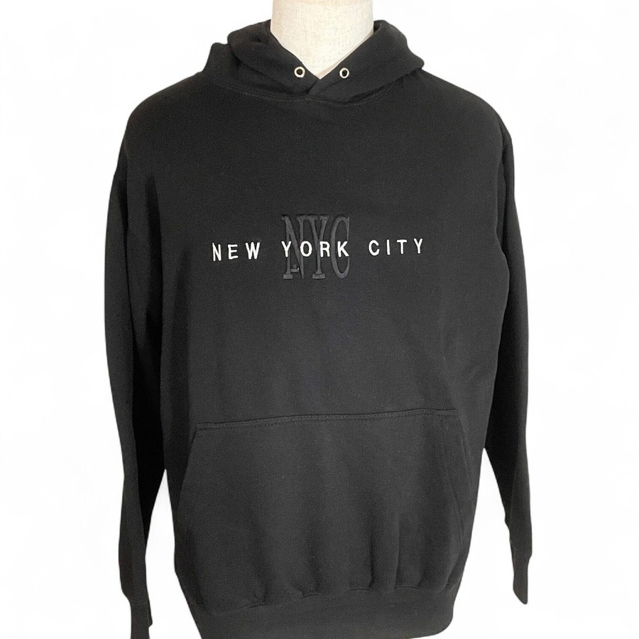 ブラックボディに“NYC”の立体刺繍ロゴが映えるフーディ。