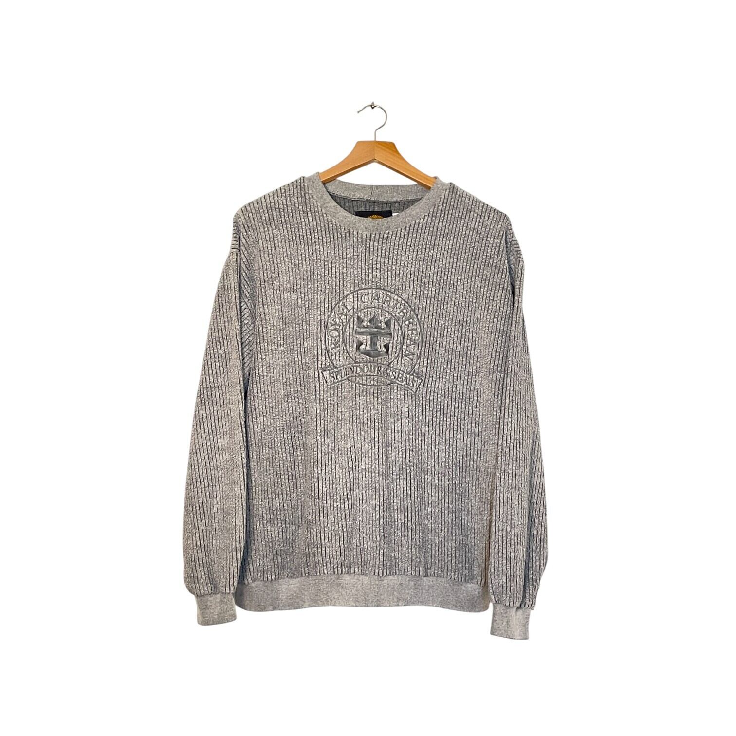 グレーカラーで、フロントに刺繍ロゴが入ったスウェットです。