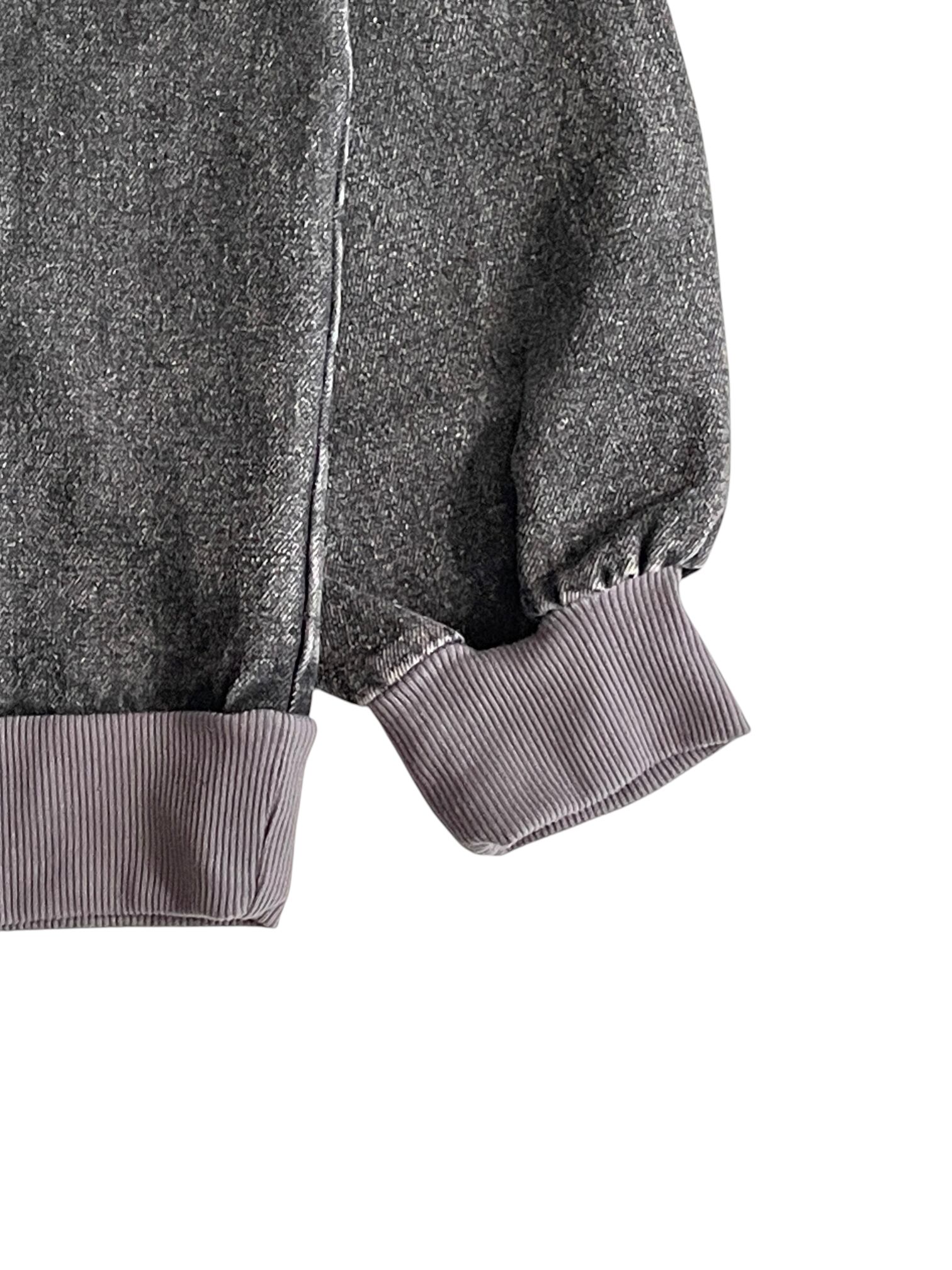 ウォッシュ加工のような風合いのチャコールグレー生地が、ヴィンテージ感のある雰囲気を演出します。