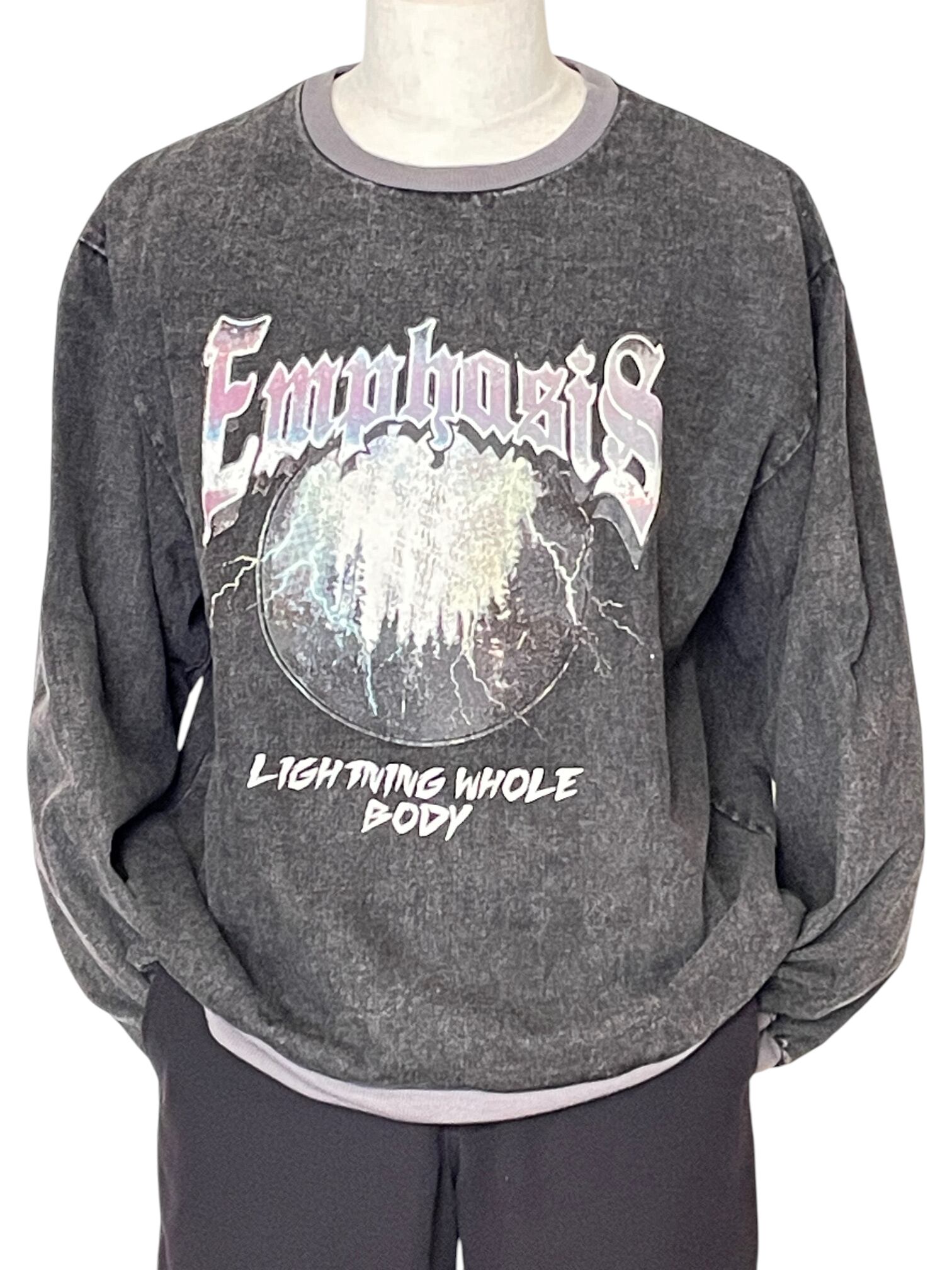 ヴィンテージ感のあるグラフィックで、コーディネートの主役になるスウェットです。