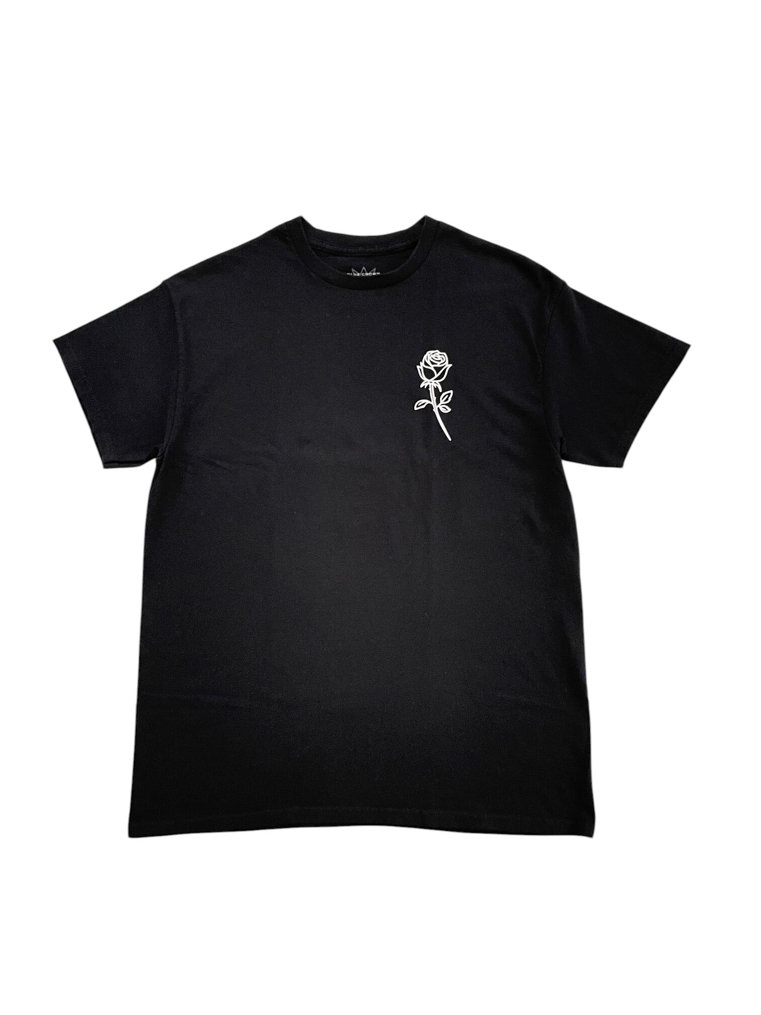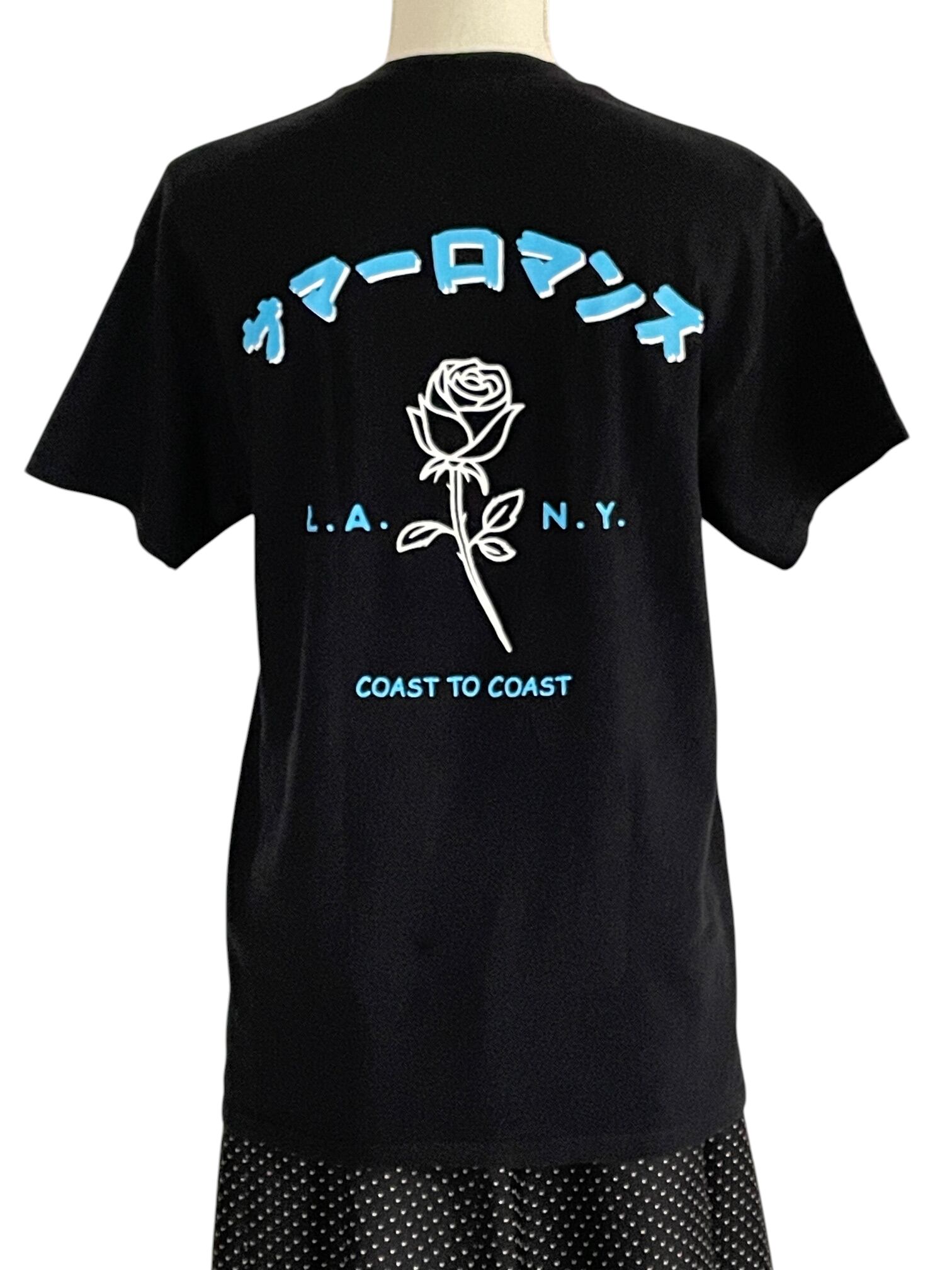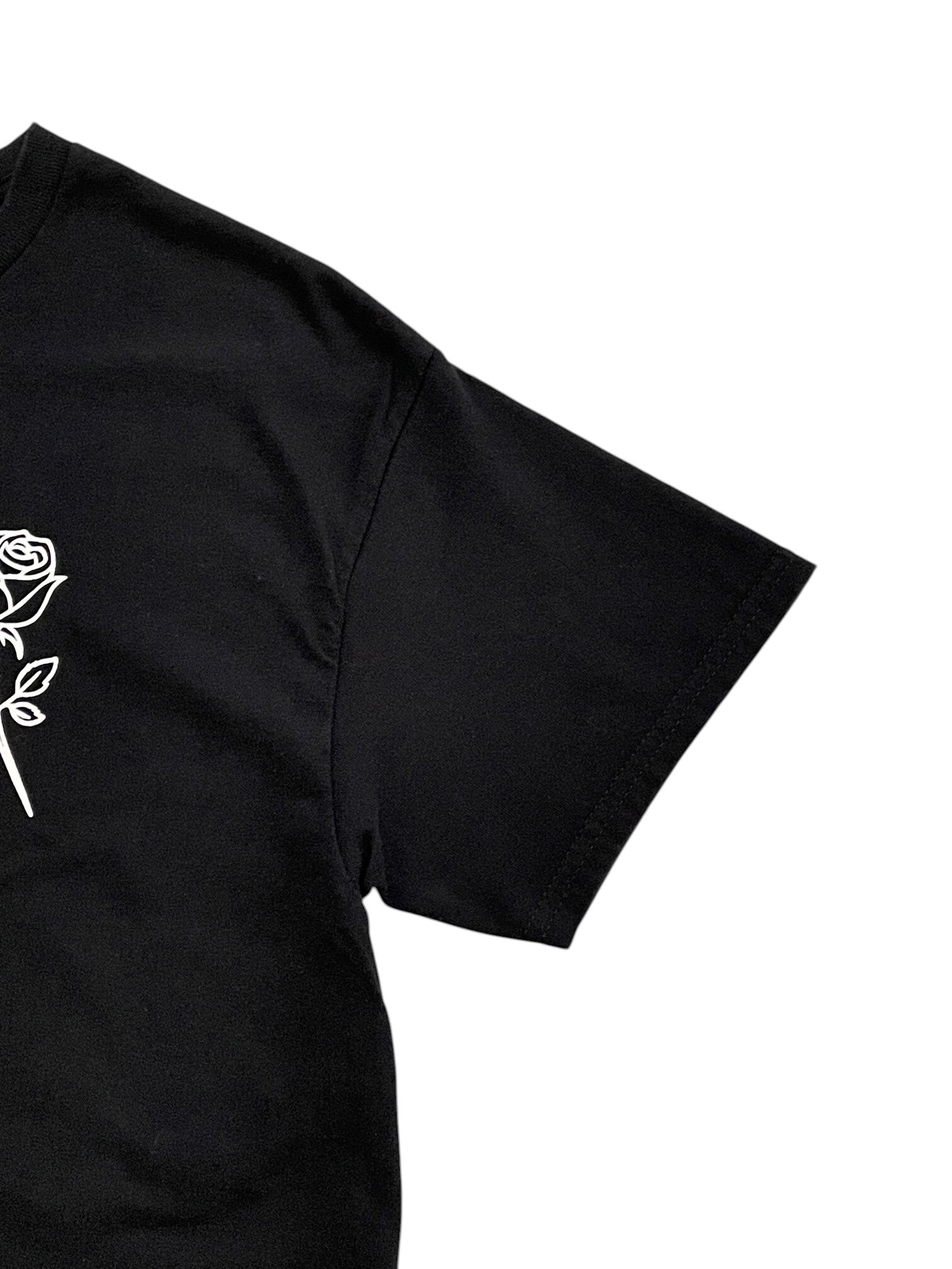 黒のボディにローズモチーフが映えるBLUE CROWNのTシャツです。