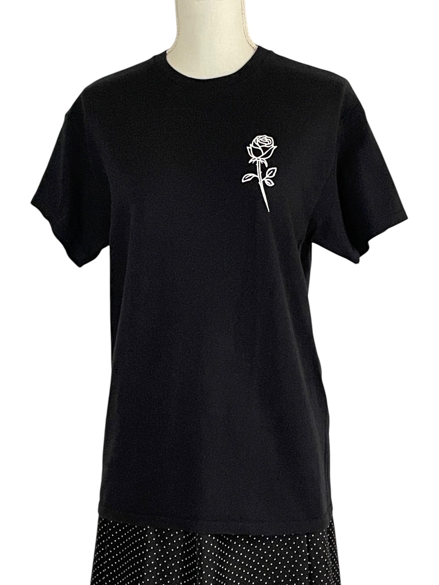 フロントは胸元のワンポイントで抑えつつ、背面には文字とバラのプリントが入った存在感のある一着。